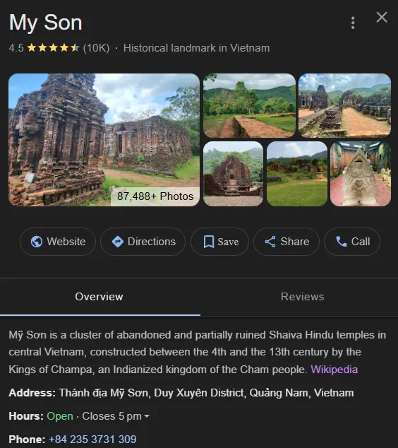 My Son Sanctuary, a UNESCO World Heritage Site, is located in Duy Phu Commune, Duy Xuyen District, Quang Nam Province, Vietnam. As one of the most beautiful places in Vietnam, it offers visitors a glimpse into the ancient Champa civilization and its stunning architecture. It’s approximately 69 kilometers from Da Nang and 45 kilometers from Hoi An, making it easily accessible for day trips from these cities.