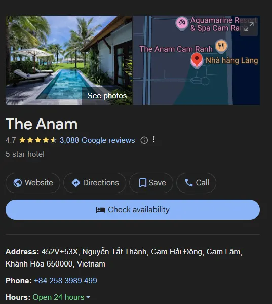| The Anam Cam Ranh – Khánh Hòa | City & Sea View | Nguyen Tat Thanh Street, Bai Dai, Cam Hai Dong Ward, Cam Ranh City, Khánh Hòa Province | $200 – $480 |