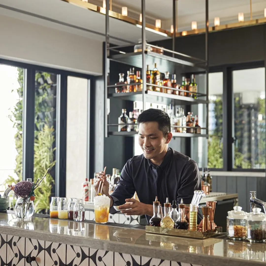 A standout is the “The French At That Time” cocktail—a creative mix of Hennessy Cognac, Pana Pomegranate liqueur, Domain Canton ginger liqueur, and fresh tangerine zest. The rich Cognac blends with a hint of spicy ginger, sweet pomegranate, and a touch of tangy tangerine, crafting a deep, flavorful cocktail that’s perfect for sipping during a romantic sunset by the infinity pool.