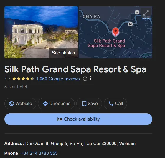 | Silk Path Grand Sapa Resort & Spa – Sa Pa | City & Mountain View | Doi Quan 6, Group 5, Sa Pa Town, Sa Pa District, Lao Cai Province | $140 – $320 |