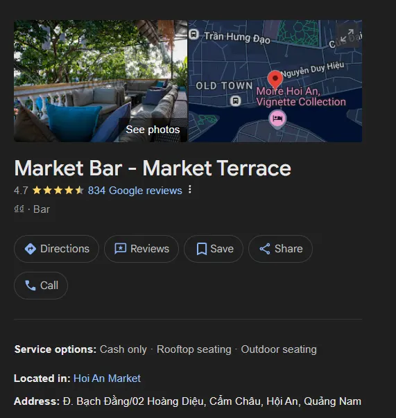 | Market Bar (Market Terrace) | Level 1 Terrace, Hoi An Cloth Market, Bach Dang Street, corner of Hoang Dieu Street, Hoi An, Vietnam | Extensive wine list, signature gin infusions, rooftop views, dishes like baked Vietnamese camembert |