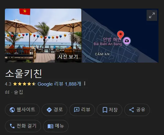 소울 키친은 호이안의 독특한 장소로, 활기 넘치는 해변 분위기 속에서 프랑스 요리와 베트남 요리를 결합한 요리로 유명합니다. 가스파초, 오징어 튀김 등의 전채 요리부터 일본식 구운 닭고기, 해산물 스파게티 등의 메인 요리, 쇠고기 볶음 국수 등의 베트남 요리까지 다양한 메뉴를 갖추고 있습니다. 특히, 이곳은 바다가 보이는 해산물 레스토랑으로, 현지 바다에서 직접 딴 신선한 해산물 요리를 선보이며, 풍부한 맛과 품질로 방문객들의 발길을 끌고 있습니다.