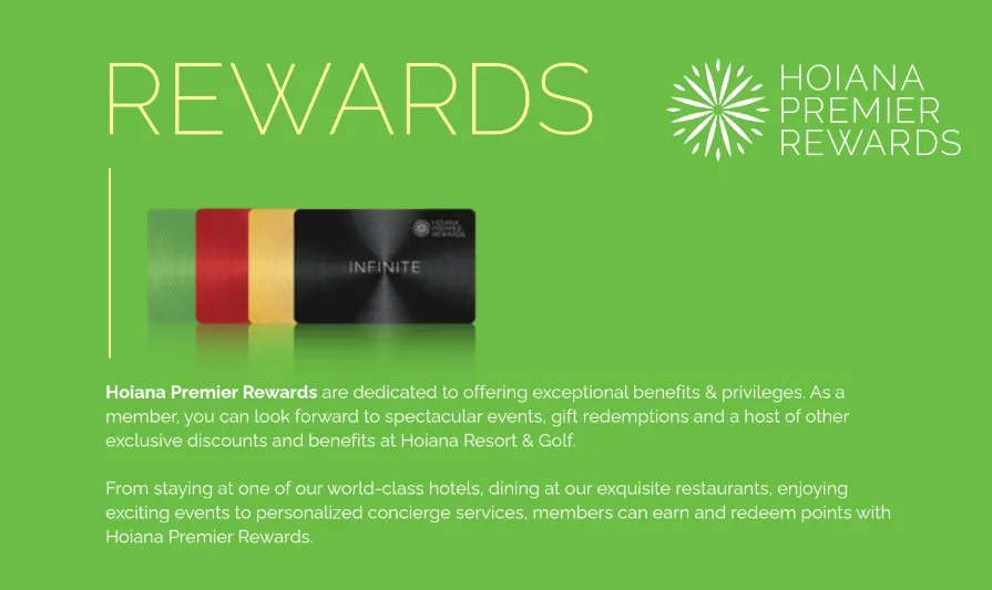 호이아나 프리미어 리워드 프로그램은 각 등급에 맞춘 혜택을 제공하여 VIP 구역에서의 경험을 더욱 특별하게 만들어 드립니다.