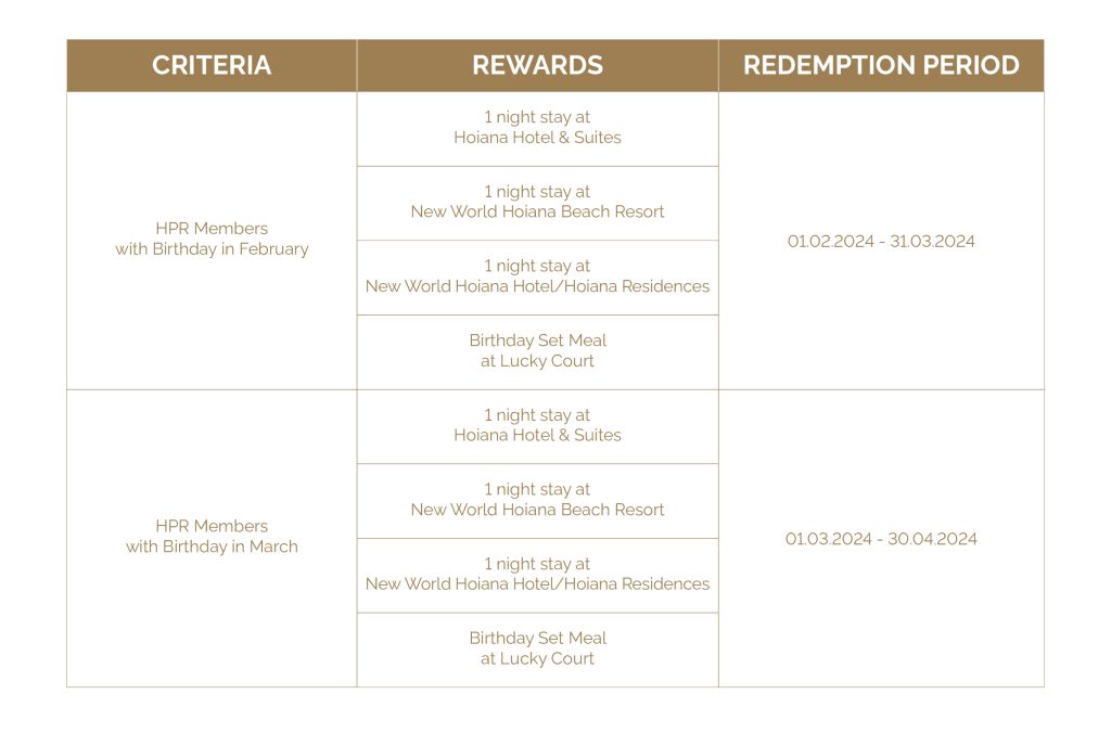 8. 2024년 2월에 생일을 맞은 HPR 회원의 경우, 숙박 리워드는 해당 기간 내에만 유효하며, 숙박 리워드를 이용할 수 있는 마지막 날은 3월 31일입니다.