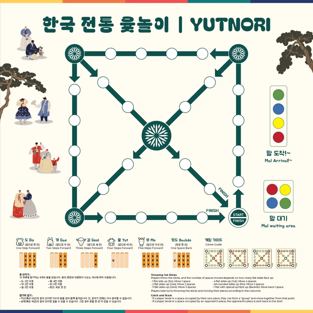 • 두 명으로 이루어진 각 팀은 번갈아 가며 윷놀이 판 위에서 두 개의 말(“말”)을 움직입니다.