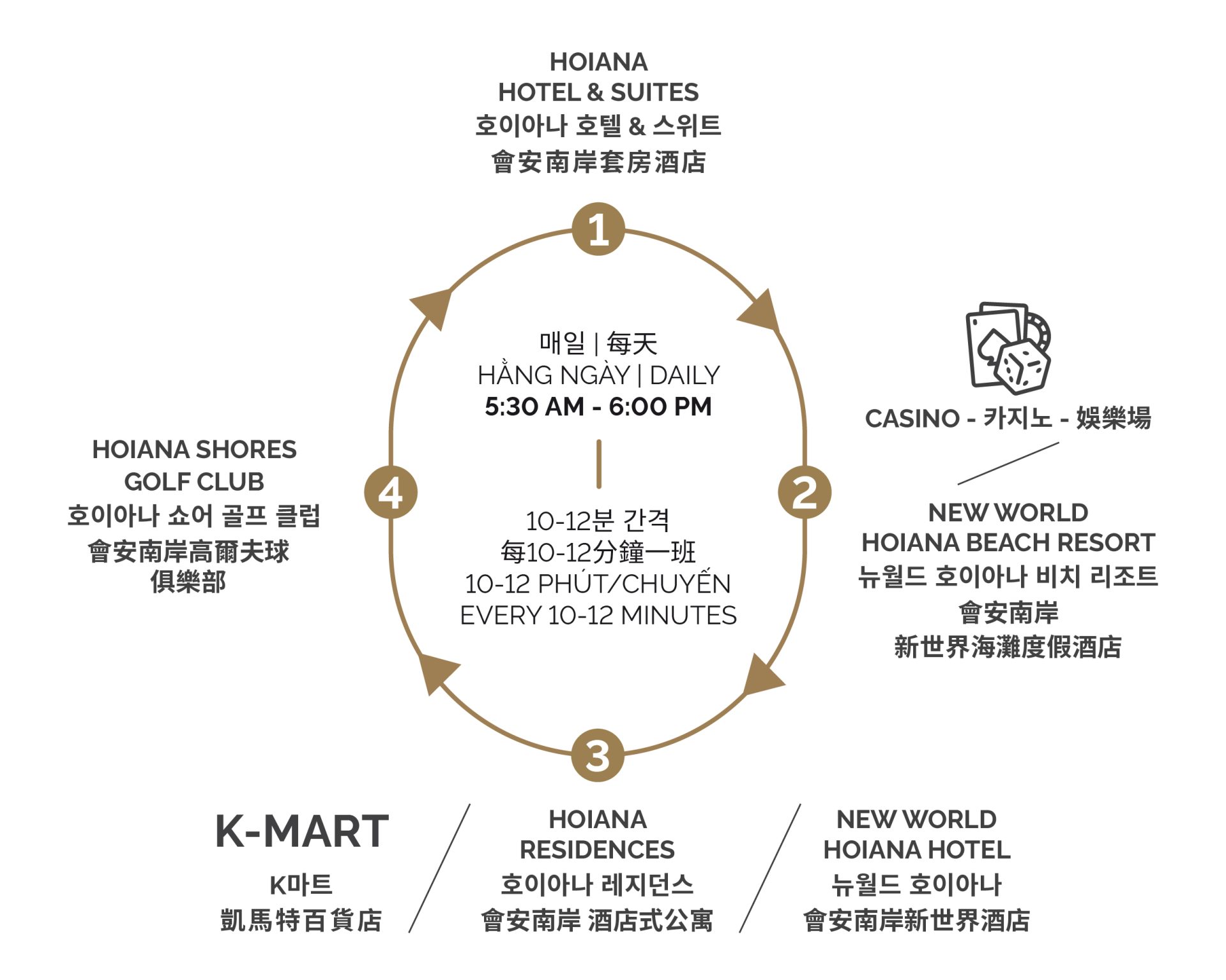 Inter-Resort Free Shuttle – our on property free shuttle services will be available to serve daily. Guests can now take rides to and from these locations: Hoiana Hotel & Suites, Casino/ New World Hoiana Beach Resort, New World Hoiana and Hoiana Shores Golf Club.