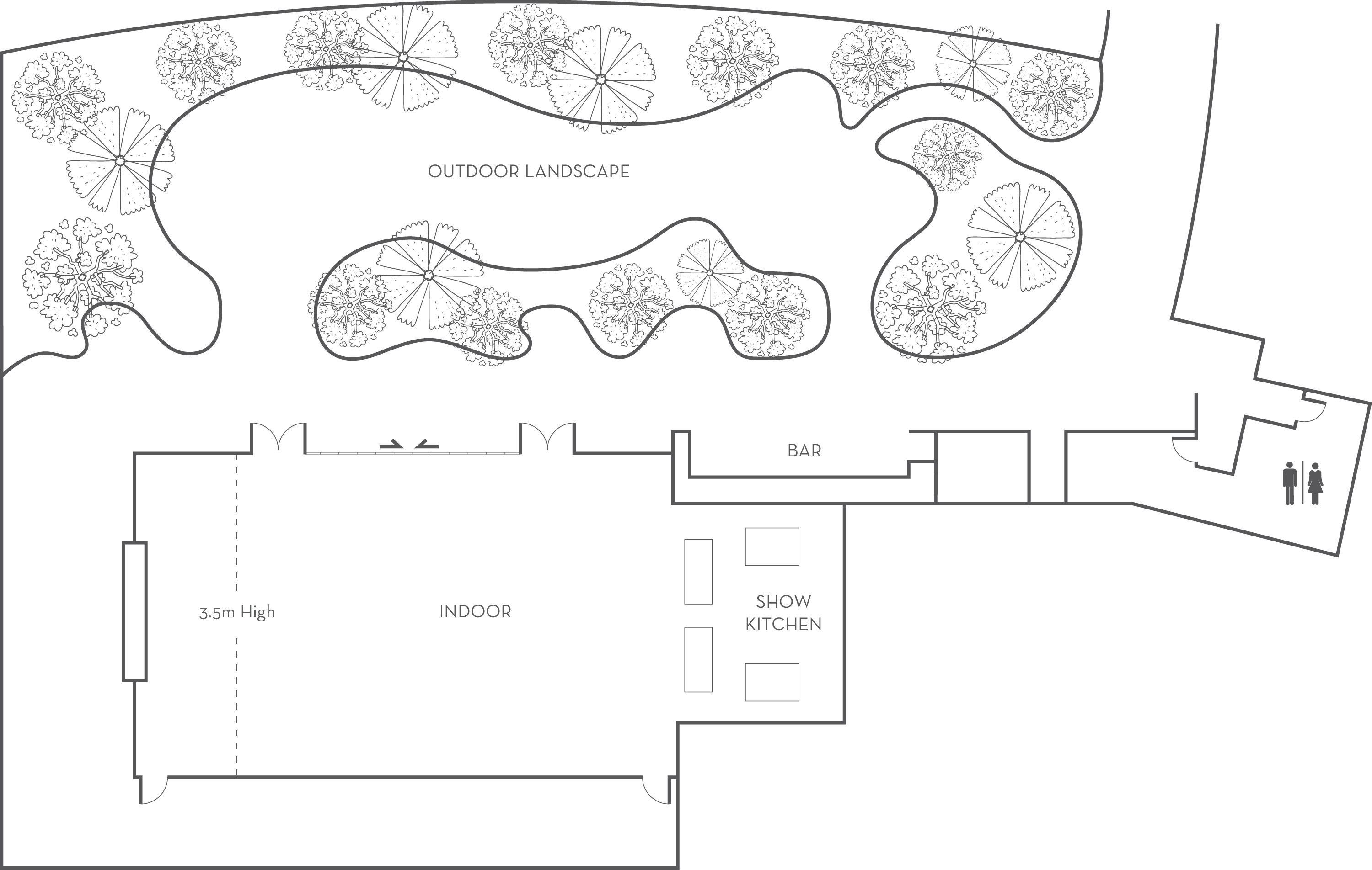 - 240m² indoor space with natural light from floor-to-ceiling glass doors
