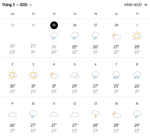 | Nhiệt độ | Nhiệt độ trung bình dao động từ 22°C đến 28°C. Cụ thể, nhiệt độ cao hàng ngày tăng từ 27°C lên 30°C, trong khi nhiệt độ thấp hàng ngày tăng từ 21°C lên 23°C. |