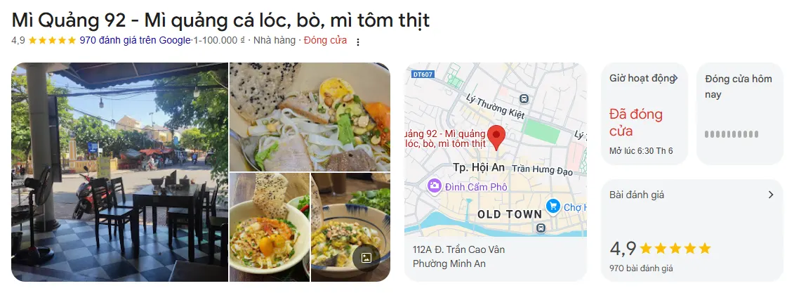 Quán Mì Quảng 92, nằm tại 71A Trần Hưng Đạo, Hội An, là địa chỉ nổi tiếng cho những ai muốn trải nghiệm hương vị mì Quảng truyền thống. Quán phục vụ đầy đủ các loại mì Quảng như mì gà, mì bò, và mì tôm, đáp ứng đa dạng sở thích của thực khách. Mỗi tô mì được chế biến tỉ mỉ, đặc biệt hấp dẫn và đậm chất Hội An, khiến cho quán Mì Quảng 92 trở thành điểm đến quen thuộc của du khách khi ghé thăm phố cổ.