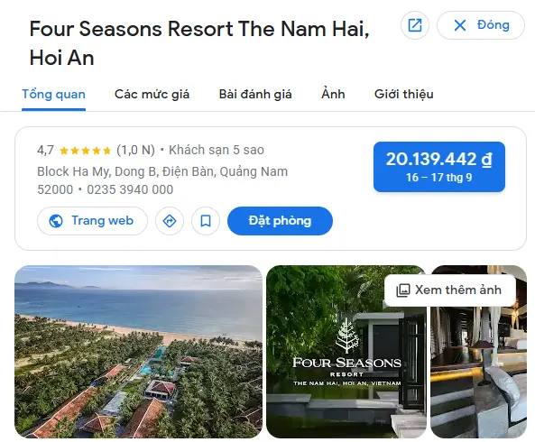 | Four Seasons Resort The Nam Hai – Hội An | Biển | Khối Hà My Đông B, phường Điện Dương, thị xã Điện Bàn, tỉnh Quảng Nam | 15.000.000 – 35.000.000 |