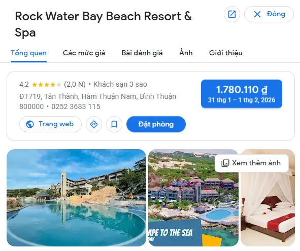 | Rock Water Bay Beach Resort & Spa – Phan Thiết | Biển | Đường DT719, thôn Kê Gà, xã Tân Thành, huyện Hàm Thuận Nam, tỉnh Bình Thuận | 1.800.000 – 4.500.000 |