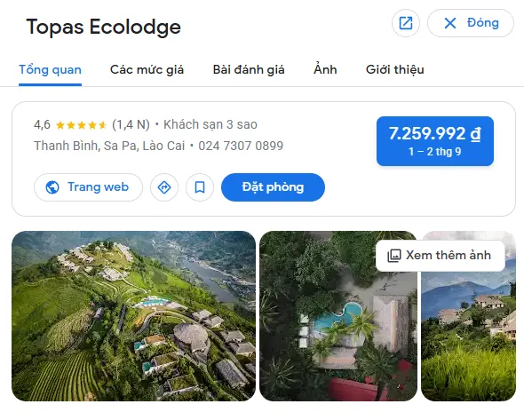 | Topas Ecolodge – Sa Pa | Núi rừng | Thôn Bản Lếch, xã Thanh Kim, huyện Sa Pa, tỉnh Lào Cai | 6.000.000 – 13.000.000 |