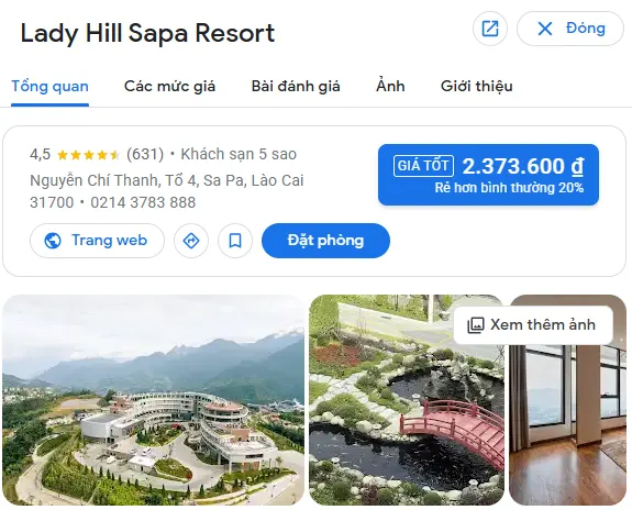 | Lady Hill Sapa Resort – Sa Pa | Núi rừng | 29 Mường Hoa, thị trấn Sa Pa, huyện Sa Pa, tỉnh Lào Cai | 2.800.000 – 6.500.000 |