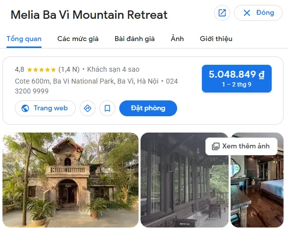 | Melia Ba Vì Mountain Retreat – Ba Vì | Núi rừng | Vườn Quốc gia Ba Vì, huyện Ba Vì, Hà Nội (cách trung tâm Hà Nội 60km) | 3.500.000 – 8.000.000 |