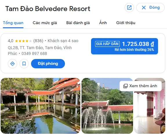 | Tam Đảo Belvedere Resort – Vĩnh Phúc | Núi rừng | Thôn 2, thị trấn Tam Đảo, huyện Tam Đảo, tỉnh Vĩnh Phúc | 2.500.000 – 5.000.000 |