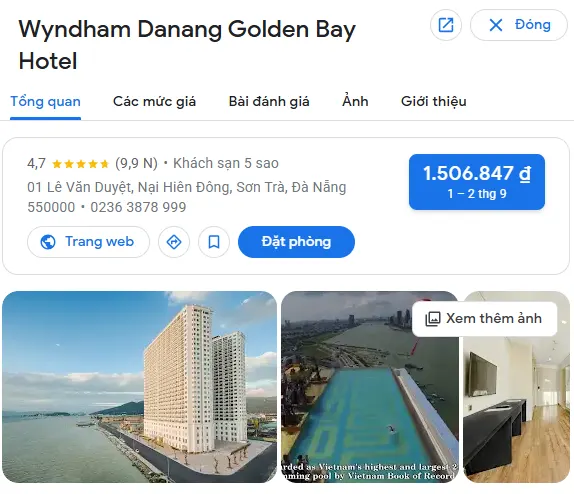 | Wyndham Danang Golden Bay Hotel – Đà Nẵng | Thành phố | Số 1 Lê Văn Duyệt, phường Nại Hiên Đông, quận Sơn Trà, Đà Nẵng | 2.500.000 – 6.000.000 |