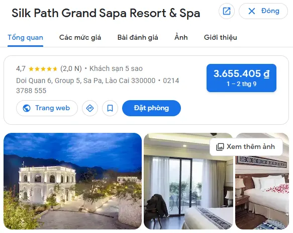 | Silk Path Grand Sapa Resort & Spa – Sa Pa | Thành phố | Đồi Quan 6, tổ 5, thị trấn Sa Pa, huyện Sa Pa, tỉnh Lào Cai (cách trung tâm Sa Pa 700m) | 3.500.000 – 8.000.000 |
