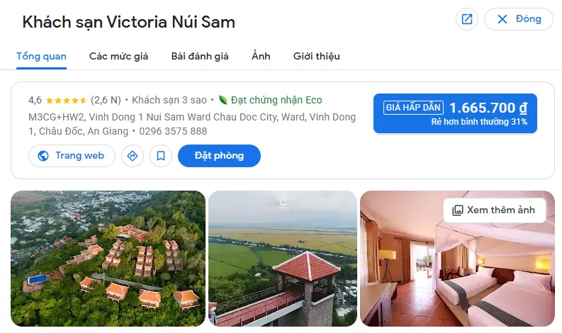 | Victoria Núi Sam Lodge – An Giang | Núi rừng | Khóm Vĩnh Đông 1, phường Núi Sam, thành phố Châu Đốc, tỉnh An Giang | 2.200.000 – 4.500.000 |