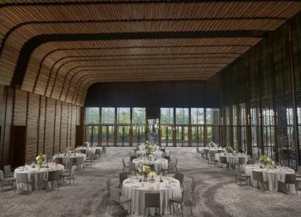 Ngoài ra, Hoiana Resort & Golf mang đến nhiều không gian đẳng cấp cho sự kiện cưới hỏi, từ sảnh tiệc đến khu vực ngoài trời. Ballroom, với chiều cao trần 9m và thiết kế không cột, rộng rãi với sức chứa lớn, lý tưởng cho các sự kiện sang trọng. Green House, ngập tràn ánh sáng tự nhiên, có sức chứa 96-120 khách, phù hợp cho tiệc ấm cúng với trang thiết bị hiện đại. Beach Lawn, sát bờ biển, rộng 1.100m², là lựa chọn tuyệt vời cho các lễ cưới ngoài trời với sức chứa lên đến 420 khách.