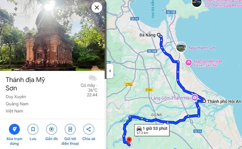 Thánh địa Mỹ Sơn nằm ở xã Duy Phú, huyện Duy Xuyên, tỉnh Quảng Nam, cách thành phố Đà Nẵng khoảng 69km và cách thành phố Hội An khoảng 40km. Đây là quần thể đền đài Chăm Pa cổ có niên đại từ thế kỷ IV, được UNESCO công nhận là Di sản Văn hóa Thế giới vào ngày 1/12/1999.