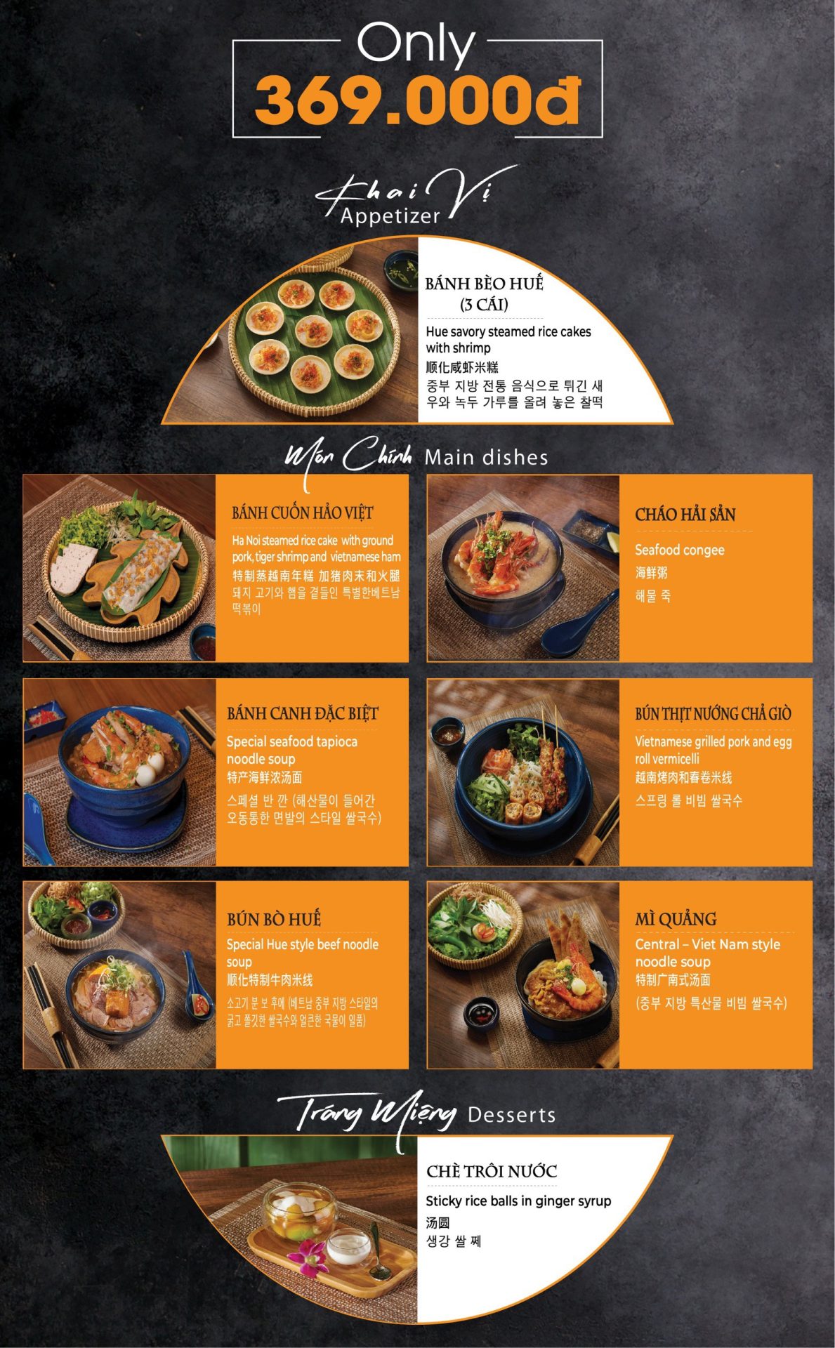 不妨用海味春捲(Cha Gio Tom Re)開啟您的美食之旅。這是一種網狀海鮮春捲,用網狀脆皮裹滿新鮮海產。或盡情享用豐盛的牛肉卷 (Bo la lot dac biet),一種用蔞葉包裹烹飪而成的牛肉。咬一口秘制蓮子拌蝦(Goi tom su dac biet)的鮮嫩,嘗一勺加入牛裏脊的秘制河粉。倘若喜歡海鮮菜肴,試試加入椰子汁的椰汁蒸大蝦(Tom su hap nuoc dua),或是酸角炒蟹(cua rang me)。